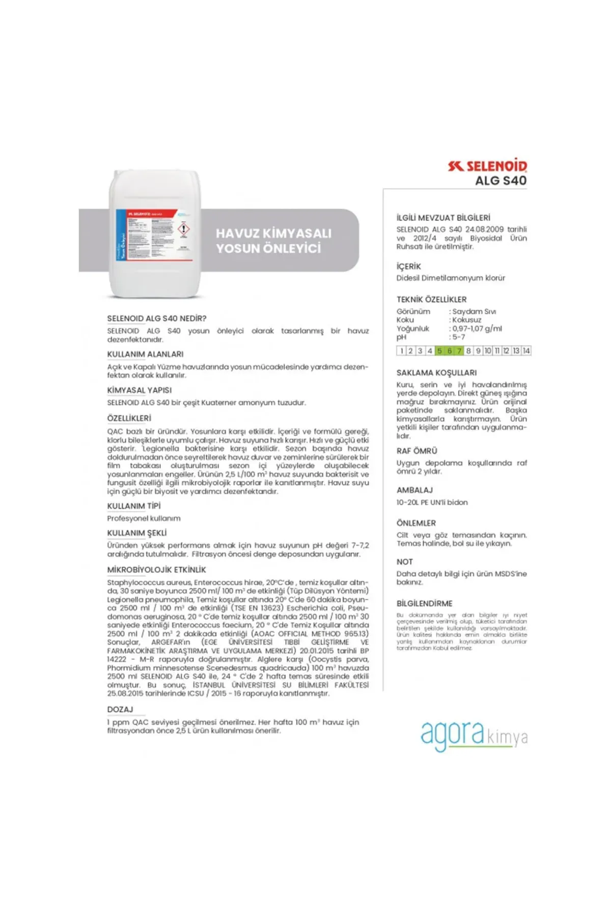 Kullanım Talimatı :100 m³ havuz suyunda, haftada bir –iki defa 2500 gr (2500 ml) kullanımı uygundur. Sezon açılışında, Selenoid Alg S40 seyreltilmeden havuz duvarlarına ve zeminine sürülür. İki saat beklendikten sonra, durulama yapmadan havuz, su ile doldurulur. Bu işlem sezon içindeki kimyasal kullanımını azaltır.KULLANIM ALANLARI