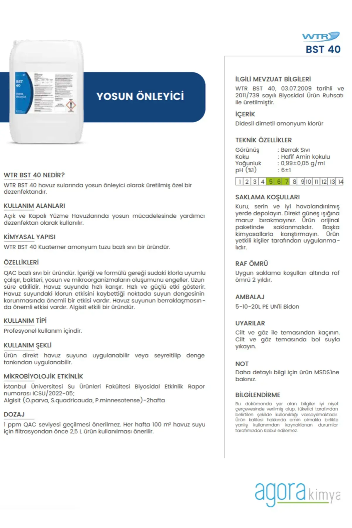 WTR BST 40 havuz sularında yosun önleyici olarak üretilmiş özel bir dezenfektandır.